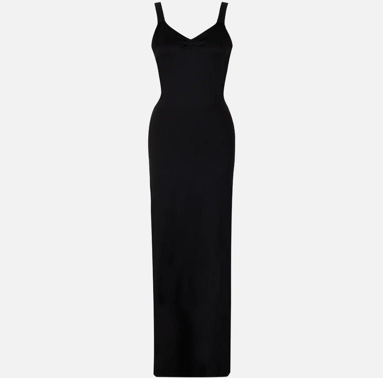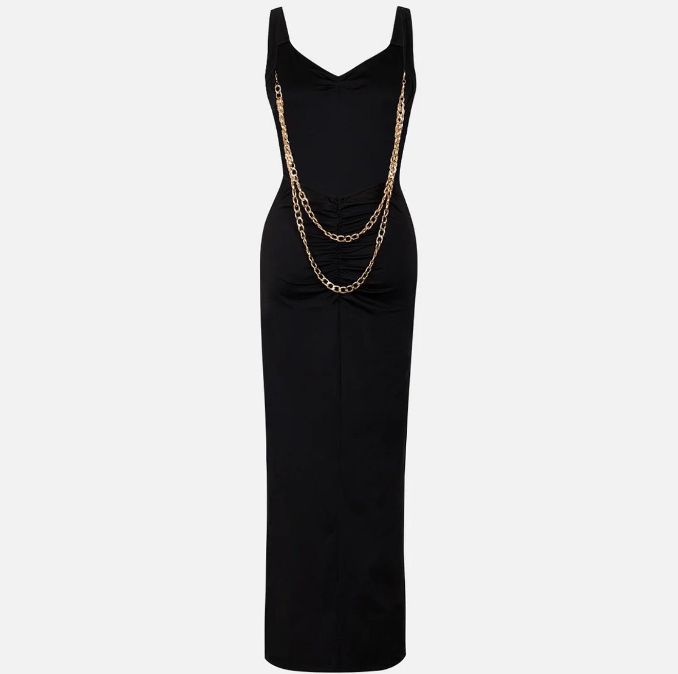 Vestido largo negro con espalda descubierta y detalle de cadena