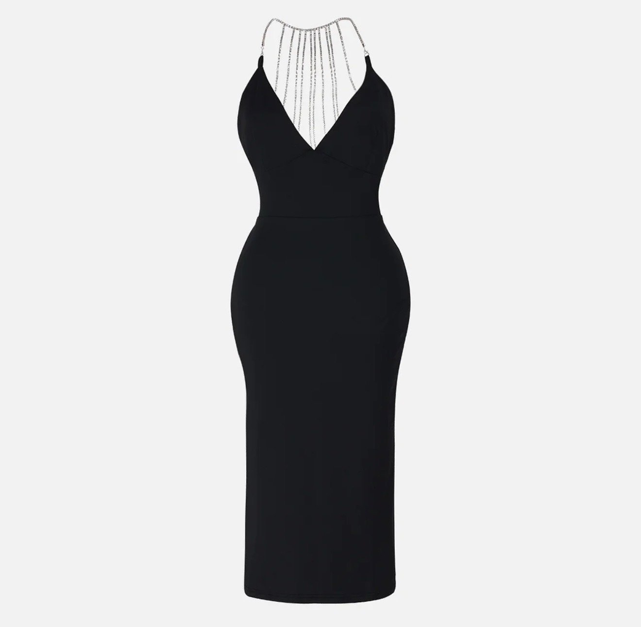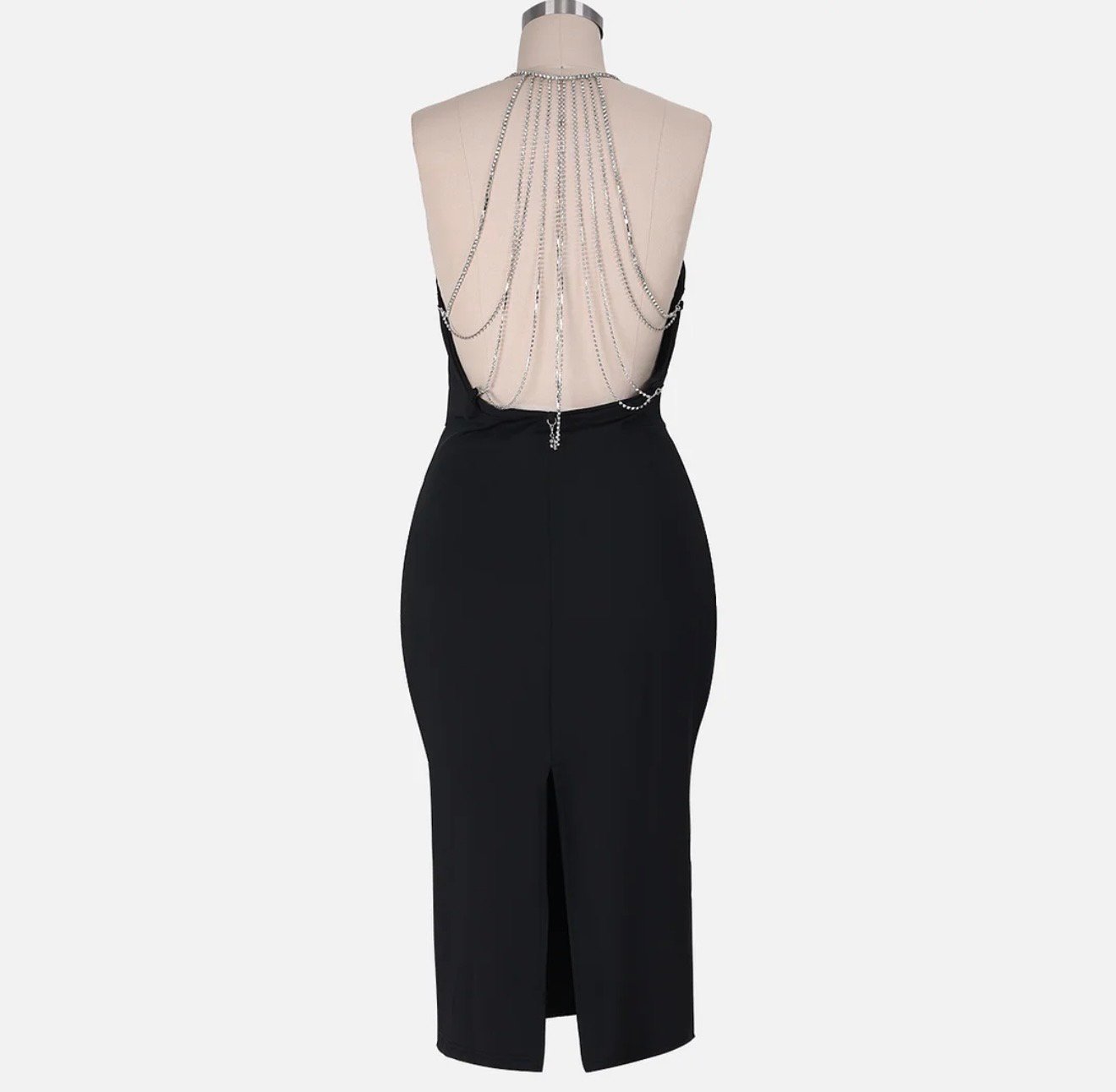 Vestido negro ajustado a la rodilla con espalda descubierta y pedrería