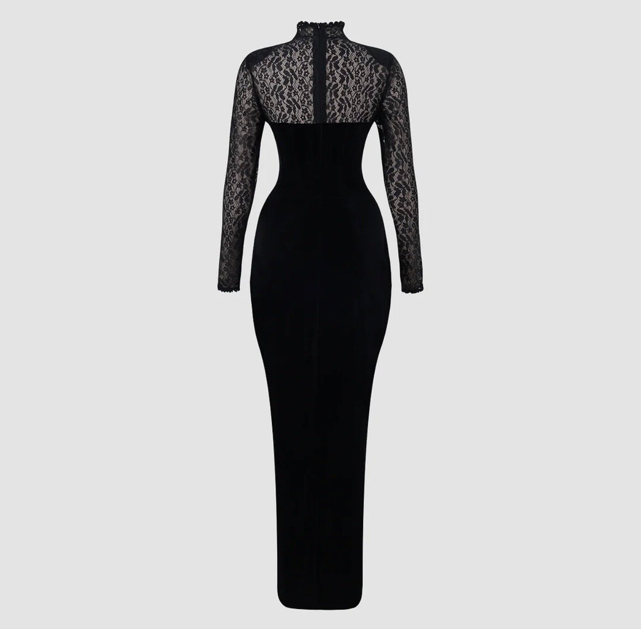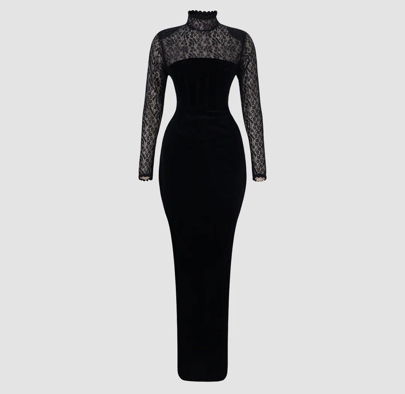 Vestido negro ajustado de terciopelo con encaje manga larga